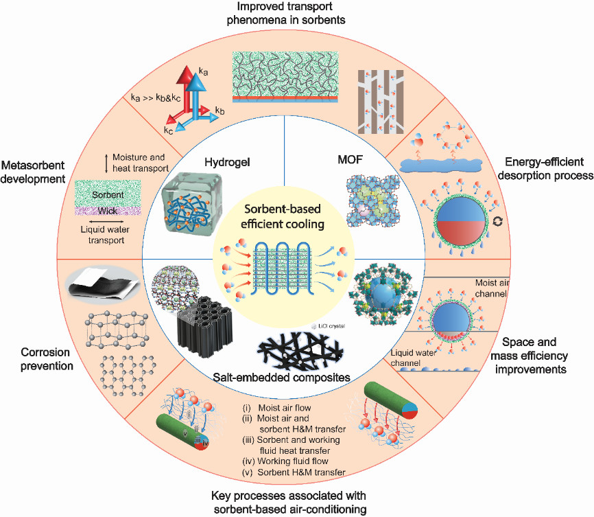 空调的大量使用对全球温室气体排放平衡构成了巨大负担。当前和未来全球湿度对与空调相关的温室气体排放具有重大影响,将潜热负荷(湿度)与显热负荷(温度)分开的解耦处理,通过吸附材料控制湿度和潜热负荷,具有巨大的碳减排潜力,尤其是在炎热和潮湿的气候地区。目前,对于空调系统的可持续发展及其碳减排具有迫切需求。将空气中的水分(湿度)分离出来,将有效减少空调运行负荷,达到节能减排效果。具体来说,可以利用水蒸气吸附/吸收材料来捕获空气中的水蒸气,不需要消耗额外能量的分离湿负荷。而在高温驱动下,吸附材料释放水分,实现解吸和再生。该再生过程可以采用低品位能源(余热),甚至太阳能驱动,进而降低能耗及碳排放。