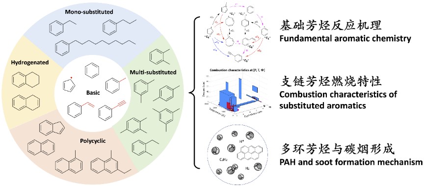芳烃是汽油、航空煤油、柴油运输燃料的三大组分类型之一,其核心结构单元苯环也是煤、生物质、固体废弃物等固体燃料的一类核心结构单元,因此芳烃燃烧反应动力学研究对于发动机燃烧、煤的清洁转化、生物质和固废资源化利用等研究领域具有重要意义。齐飞、李玉阳团队自2005年起在芳烃燃烧反应动力学领域开展了长期研究,是国际上该领域的主要研究团队之一,已发表论文50余篇。本篇论文结合该团队近二十年来的研究成果和国内外其他团队的研究进展,从基础芳烃反应机理、支链芳烃燃烧特性、多环芳烃与碳烟形成等方面,对芳烃燃烧反应动力学研究进行了全面综述与分析,展望了实验测量、理论计算、模型构建等方向的未来发展,揭示了芳烃燃烧基元反应、苯环与支链相互作用、芳烃低温燃烧反应动力学、多环芳烃生成机理等问题的研究机遇与挑战。该工作对发动机清洁高效燃烧技术和先进固体燃料转化利用技术的发展具有指导作用。