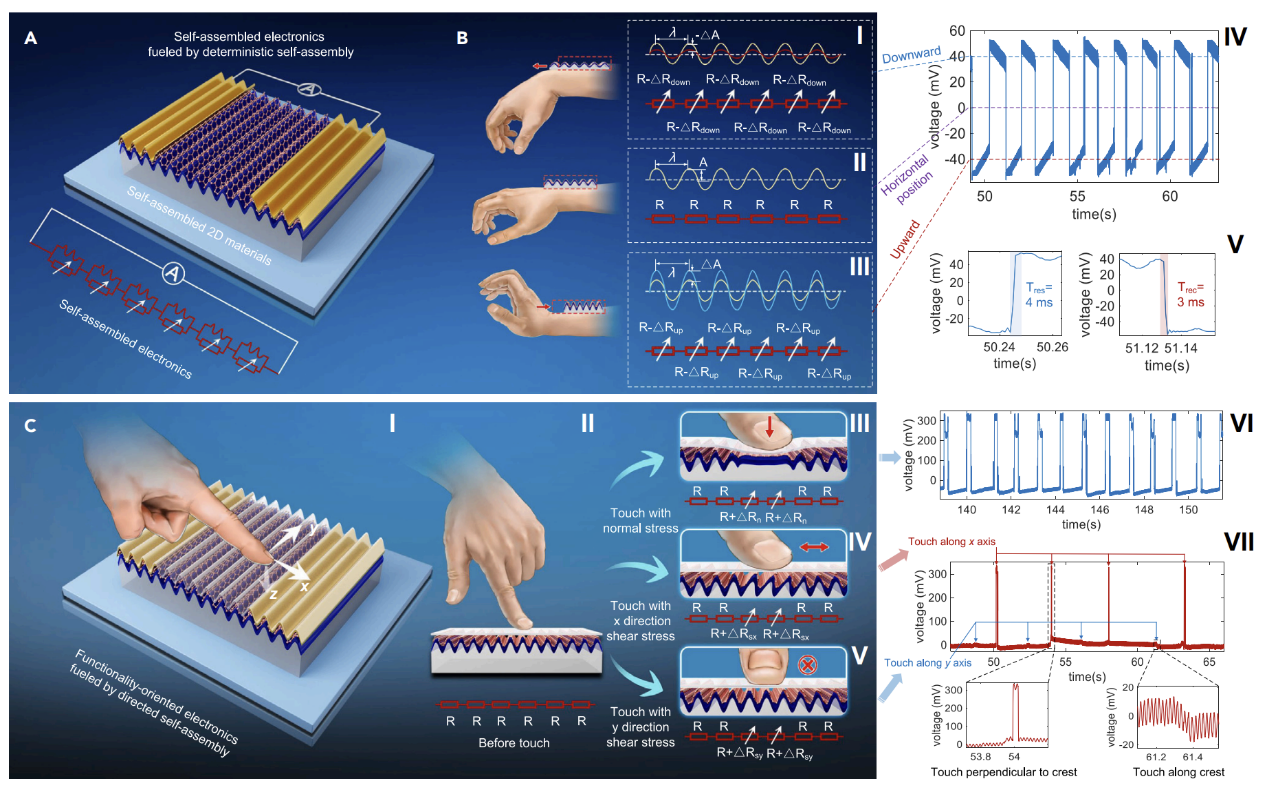 上述高可设计性的确定性力学自组装行为赋予了二维薄膜材料新的性能,如各向异性压阻效应和光-电耦合效应。利用上述确定性力学自组装技术,提出了一个全新自组装电子器件的概念,并研制了基于二维材料的确定性自组装微纳电子器件,如超快速响应 (响应时间为4ms)的可穿戴手势传感器和用于法向力和剪切力识别的三维各向异性触觉传感器(图3)。上述结构单一失稳态引导的确定性力学自组装现象可以极大地促进面向二维薄膜材料和自组装柔性电子器件的CMOS兼容型柔性微纳制造技术。
