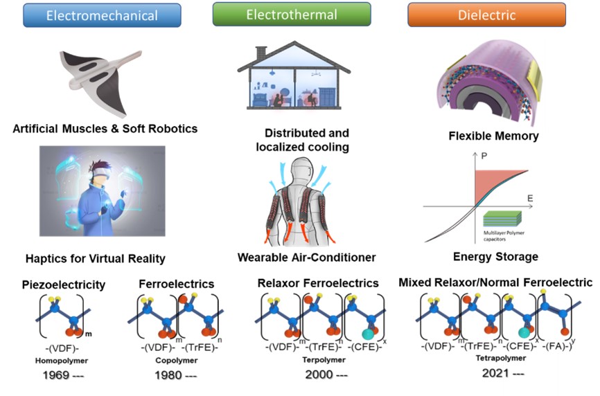 高分子铁电材料具有可塑性高、易于制造成复杂形状、机械韧性和自发极化等独特的特点,能够实现电、机械和热能之间的高效交叉耦合,产生一系列如储能、压电/电致伸缩效应、电卡/热释电效应、铁电存储等效应。这些以含氟高分子为主体的聚合物材料可以轻松加工成轻薄、坚韧和柔韧的薄膜和纤维,适用于便携式、小型化和可穿戴的电活性装置。
