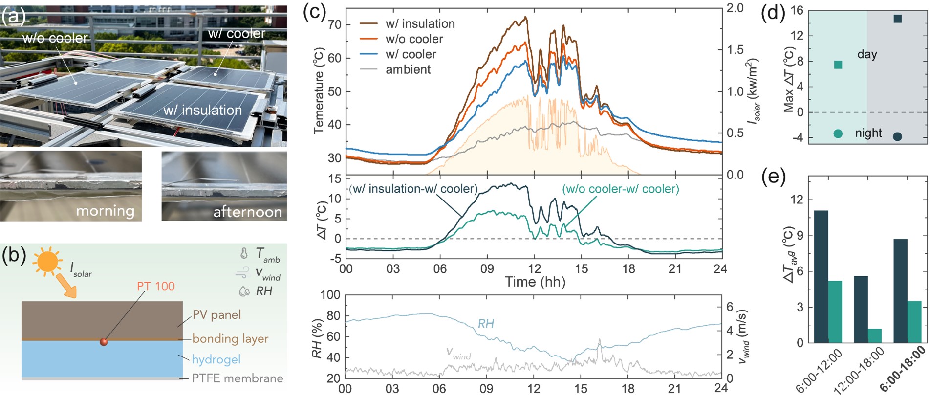 太阳能光伏组件能够将20%左右的太阳辐射转换为电能输出,但同时约70%的太阳能则被转换为废热,导致组件温度升高。高温不仅使光伏组件的发电功率下降,也会加速组件老化从而影响其寿命。研究开发了一种吸湿性水凝胶,可以在夜间吸附环境空气中的水蒸气,储存的水则在白天成为冷却介质,通过水分蒸发过程带走光伏组件工作过程中产生的热量。基于该吸湿性水凝胶,研究开发的复合背板,在不需要任何金属部件或大量冷却介质的情况下,能够实现良好的持续性被动式降温效果。在针对小组件样品的户外实验中,该复合背板在连续观测中展现了稳定的冷却性能,相比于传统组件降温7-15°C。此外,该复合背板相对于普通光伏组件成本增加在10%以内,组件重量增加为2.6 kg/m2左右。因此,该技术实现了光伏组件的低成本、轻量化和被动式降温,并在实际工程应用中具有发展潜力。