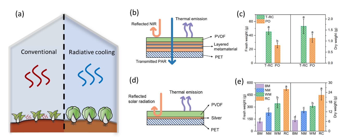 作为温室覆盖材料的透射型辐射制冷薄膜(T-RC)具有大气窗口波段高发射率、光合有效辐射波段高透过率,以及近红外波段高反射率。在田间试验中,与常用的PO薄膜相比,T-RC薄膜具有18.6℃的降温效果,并可以使樱桃萝卜的生长速度提高76.2%。作为温室地膜的反射型辐射制冷薄膜(RC)在大气窗口波段具有高发射率,在可见光和近红外波段均具有高反射率。在田间试验中,RC薄膜可将土壤地下2cm处地温较对应的空白土壤地温降低12.5℃,并可以使杭白菜的生长速度提高127.35%。