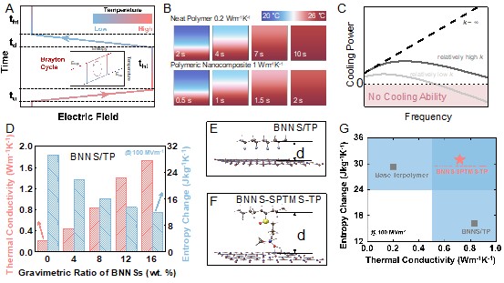 电卡(Electrocaloric,EC)制冷能够直接高效利用电能,易于实现高COP和低TEWI。EC聚合物材料凭借其柔性、自修复、低成本等优点受到学术界的广泛关注。然而,低热导率是掣肘EC聚合物应用的关键问题。在聚合物中添加高热导率纳米填料是改善其热导率的有效手段。在这项工作中,为了避免填料的EC效应对聚合物性能带来的干扰,钱小石教授团队将电学惰性的BNNS作为填料,掺杂至P(VDF-TrFE-CFE)三元共聚物(terpolymer),并通过界面调控合成了BNNS-SPTMS-TP,这种材料兼具高热导率、高熵变、宽工作温度窗口、高击穿场和高机械模量等特性,有效提高了EC制冷器件的制冷功率密度和温宽,为EC制冷器件的设计提供了便利。