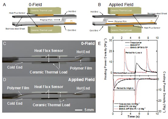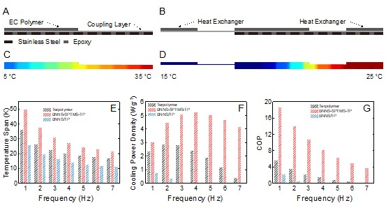 在薄膜EC制冷器件中,由于BNNS-SPTMS-TP兼具高导热性和高熵变特性,与简单混合的BNNS/TP和terpolymer相比,使用BNNS-SPTES-TP的器件具有更大的制冷功率密度。