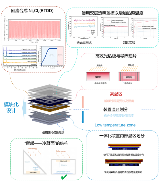 综合技术方案是扩大化低成本合成高性能MOF吸附剂Ni2Cl2(BTDD)的技术方案,以及与之配套的模块化紧凑式太阳能空气取水单元。该装置可以实现无任何外界电力等辅助能源或设备的情况下凭借太阳能实现连续运行,同时模块化的构造使得装置可以通过改变模块的数量,极为轻松地实现个性化定制。该技术方案为空气取水技术走向商业化奠定了基础,有望为世界水危机贡献交大智慧,实现从“久旱逢甘霖”到“久旱造甘霖”的重大突破。