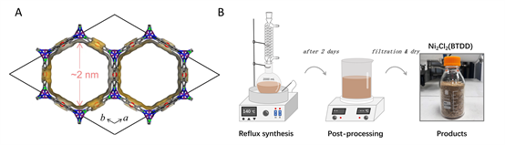 在材料层面,研究团队经过筛选,选择Ni2Cl2(BTDD)作为首选材料。其一维孔道具有丰富且亲水的开放金属位点,优异的水稳定性和水吸附性能使其从众多MOF材料中脱颖而出。论文通过操作简易的回流法实现了百克级Ni2Cl2(BTDD)的制备,并结合配体和金属盐的溶解特性,依次采用水、N,N-二甲基乙酰胺以及甲醇洗涤的操作进行材料后处理以释放孔道。相比于现有的扩大化合成方案,回流法的生产成本缩减至79 CNY g-1。