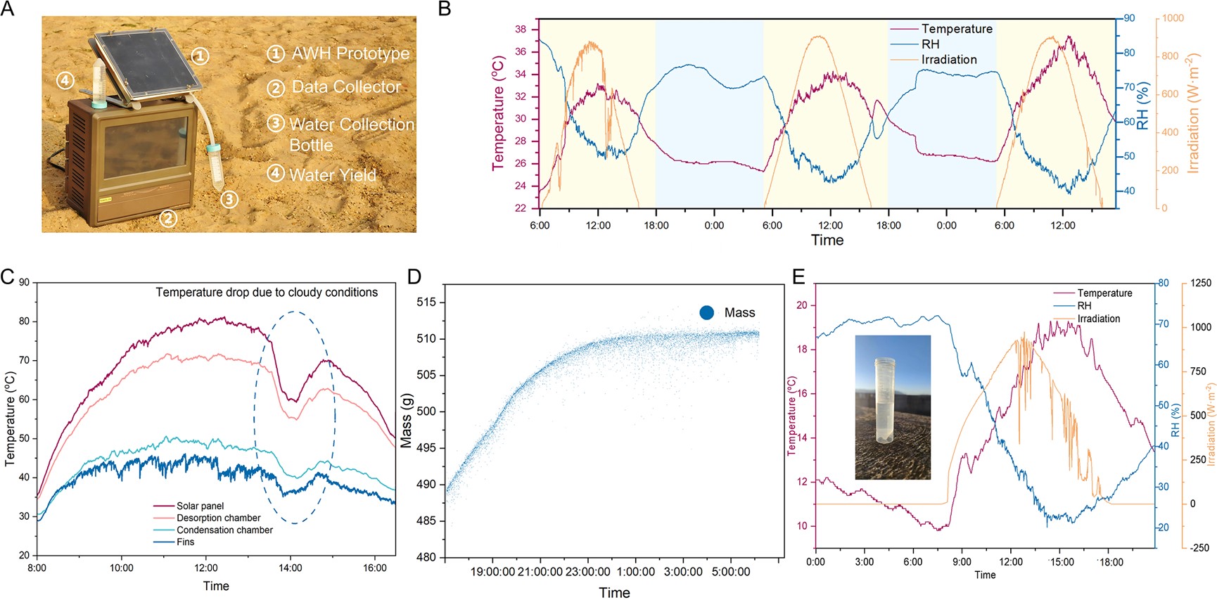 基于扩大化合成吸附剂工艺探索,王如竹教授团队开发了一种高度紧凑的模块化且热分区的空气取水器。该样机实现了Ni2Cl2(BTDD)在装置层面的首次应用,在实验室条件下实现了在装置每平米仅使用不到四分之一重量吸附剂的情况下,得到可媲美复杂双级结构取水器的840.5 g m–2高取水量,以及23 L m–3的超高体积取水密度。为了进一步对装置性能进行检验,研究团队在上海、昆明等不同地点进行了实地测试,并对所得水样进行了水质测试。在昆明干旱寒冷的冬季,该取水机组在0.04 m2依然实现了22.6g的高水生产量,且水样离子浓度满足WHO对于直接饮用的要求。