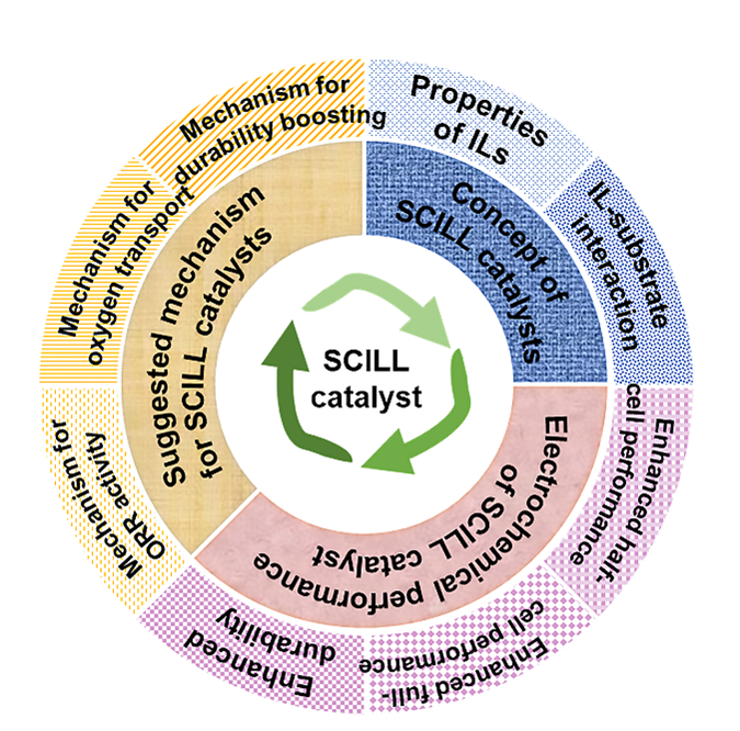 质子交换膜燃料电池(proton exchange membrane fuel cells,PEMFCs)具有高能量密度、零污染等特点,成为汽车交通和便携式能源领域最具潜力的选择之一。然而,由于催化层中大量使用铂基催化剂,导致燃料电池汽车成本居高不下,严重阻碍其商业化应用。近年来,得益于高氧溶解度、高质子电导率、高热稳定性和化学稳定性,离子液体被用于质子交换膜燃料电池中的催化剂修饰(solid catalysts with an ionic liquid layer,SCILL),得到了优异的氧还原活性和燃料电池性能,因此受到广泛关注。