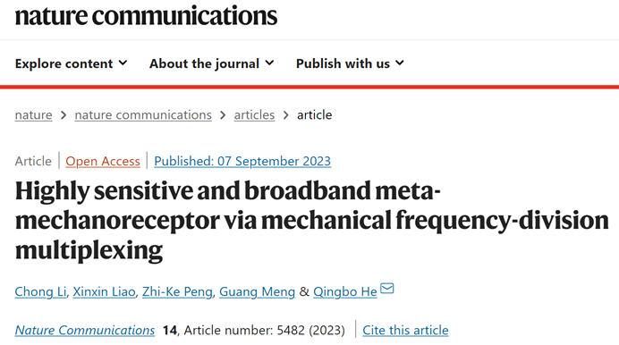 近日,80足球直播吧何清波教授课题组在Nature Communications上在线发表了题为“Highly sensitive and broadband meta-mechanoreceptor via mechanical frequency-division multiplexing”的研究论文,提出了一种机械式频分多路复用概念,研制出高灵敏度宽频微动超机械感知器。80足球直播吧博士研究生李崇为论文第一作者,何清波教授为通讯作者,孟光教授、彭志科教授、廖昕昕博士为合作者。