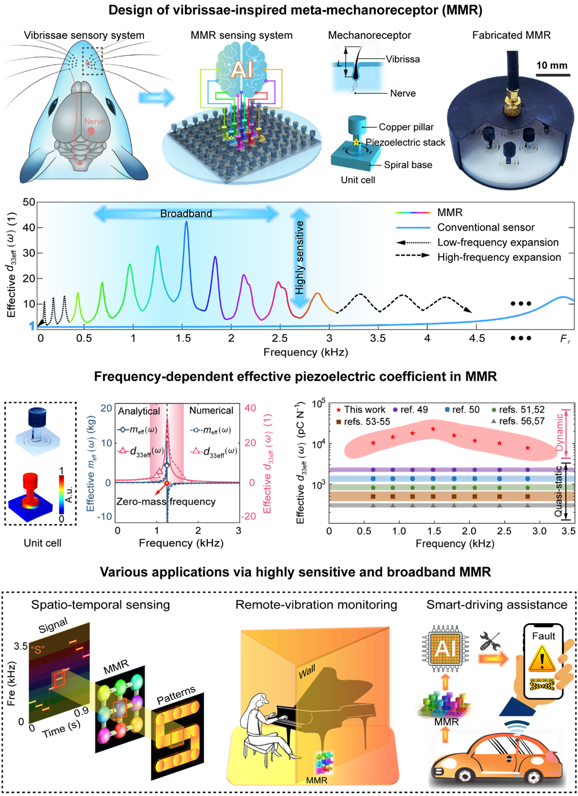 为了解决这一动力学难题,受小鼠胡须微动感知系统的启发,研究人员研制了一种超机械感知器(MMR),由在不同频率具有零等效质量的多个压电式局域谐振器组成,实现了高灵敏和宽频带的微动感知。研究人员证明了这些零等效质量的压电谐振器具有频率相关的等效压电转换系数,该特性在本征压电材料中是无法实现的,并且在零等效质量对应的频率处具有接近无限大的等效压电转换系数。研究人员将这些具有不同谐振频率的压电谐振器镶嵌成一个超材料结构,即形成“超机械感知器”。