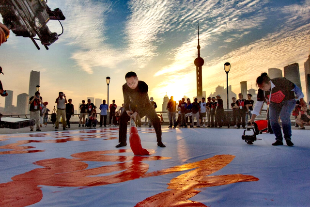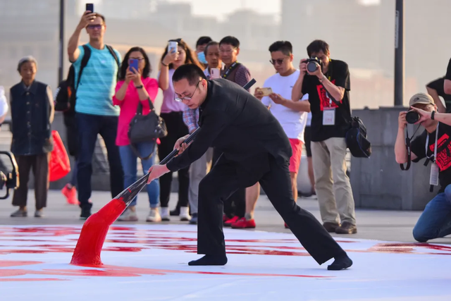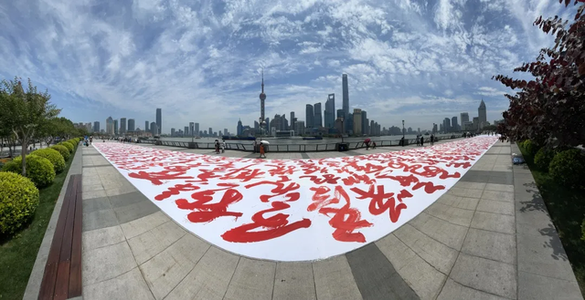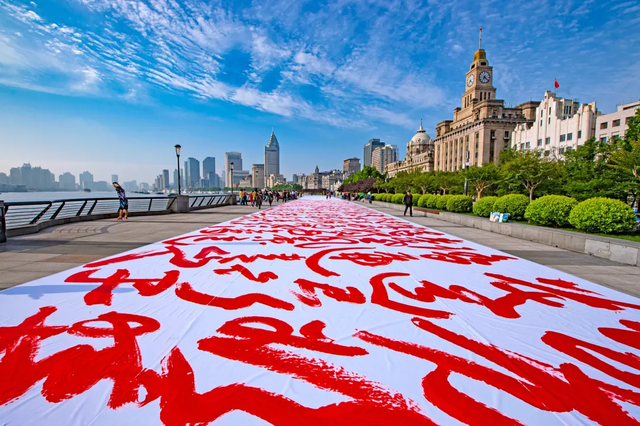 On the morning of June 5th, Prof. Xu Qinghua from the School of Media and Communication, SJTU put on a fabulous cursive calligraphy show titled "Look to this age" on the Bund View Avenue, Shanghai. He handwrote chairman Mao's oft-quoted poems in large cursive scrolls with a total area of 1,000 square meters, starting with the characters "东方欲晓 (Breaking dawn in the east)" and consummating with "还看今朝 (Look to this age)".