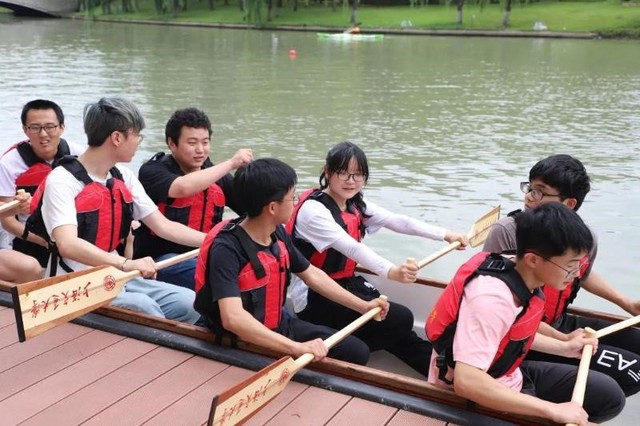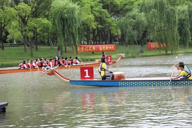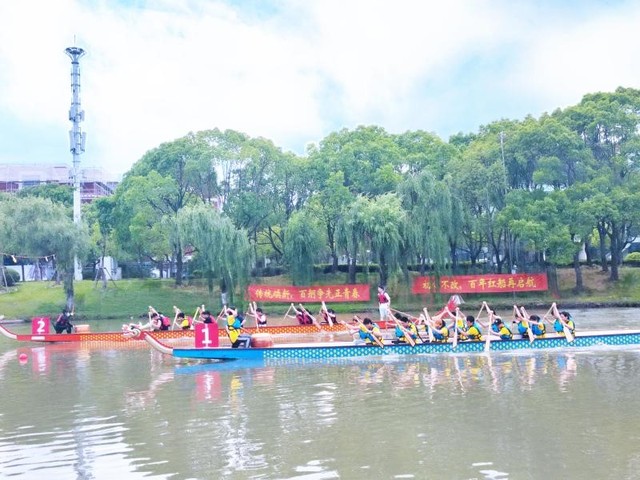 As the whistle sounded, the dragon boat race began. The two dragon boats in the first group set sail quickly, cutting waves and waves along the way. The contestants strived to paddle and forged ahead on the river. Attracted by the competition, many teachers and students stopped by the river to take pictures and cheer for the contestants. Everyone enjoyed the great atmosphere.