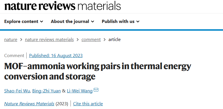 Recently, Prof. Li-Wei Wang’s research group from School of Mechanical Engineering published a paper entitled “MOF-ammonia working pairs in thermal energy conversion and storage” in Nature Reviews Materials (IF=83.5). This Comment paper highlighted the superiorities of metal-organic framework (MOF)–ammonia working pairs for adaptable thermal management under extreme climates, discussed strategies to design MOFs with high stability and ammonia sorption capacity, and prospected the way forward of these working pairs. The first author is Shao-Fei Wu, a PhD candidate, and the corresponding author is Prof. Li-Wei Wang.