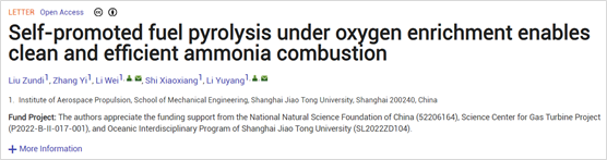 Recently, Prof. Yuyang Li’s research group from School of Mechanical Engineering at Shanghai Jiao Tong University published a paper titled Self-promoted fuel pyrolysis under oxygen enrichment enables clean and efficient ammonia combustion in The Innovation Energy, a leading international journal in the energy field. The research reveals that oxygen enrichment significantly enhances the self-promoted pyrolysis of ammonia in flames, thus overcoming the challenge of simultaneous combustion enhancement and pollutant control. The first author is Zundi Liu, a PhD candidate, and the corresponding authors are Prof. Yuyang Li and Asst. Prof. Wei Li.