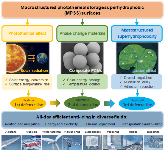 MPSS surfaces construct multiple defense lines to achieve efficient all-day anti-icing in various applications: (1) Utilizing the inherent anti-icing properties of superhydrophobic surfaces to inhibit ice-nucleation and reduce ice adhesion; (2) Combining biomimetic structures to regulate droplet movement, weakening solid-liquid contact and strengthening droplet detachment; (3) By introducing the photothermal effect, the surface is heated up through photothermal conversion to avoid the failure of superhydrophobicity under low-temperature conditions; (4) Adding phase change materials for energy storage and stable temperature control, and thus solve the problem of energy imbalance in photothermal effects under different conditions.