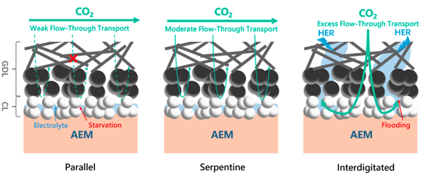 Focusing on the CO2RR technology and the design of the “zero-gap CO2 electrolyzer”, this article elucidates the mechanism of the flow field on the performance of CO2 electrolysis. It points out the importance of the flow field on the water-gas transport process inside the CO2 electrolyzer under the industrial-relevant current density and operation condition. Through experiments and simulations to analyze the effects of different flow field configurations on the performance and durability of CO2 electrolyzers, the core design strategy for optimizing the flow field of CO2 electrolyzers is elucidated: i.e., improving the uniformity of the CO2 distribution, inhibiting CO2 starving transport while suppressing the drainage. Based on this design strategy, the article designs a simple and improved flow field, which improves the electrolysis performance by 43.5% compared to the conventional parallel flow field. This work illustrates the necessity of enhancing the study of the water-gas mass transport process in CO2 electrolyzers, which is instructive for the development of commercial CO2 electrolyzers in the future.