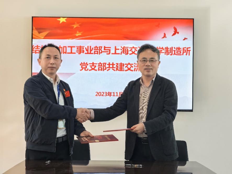 航天八院800所前身为1958年成立的国防部五院一分院第二设计部,历经65载峥嵘岁月,为祖国孕育了多位航天专家和全国劳模,为我国航天事业的发展做出了巨大贡献。结构件加工事业部党支部书记周瑞红、制造所教工党支部书记康小明分别介绍了支部情况和学术科研方向。双方签订了支部共建协议。制造所所长陈明教授希望在支部共建的基础上,继续深化在国产高端装备、高性能工具、数字化检测、先进制造工艺等方面的技术合作,助力中国航天事业的高质量发展。