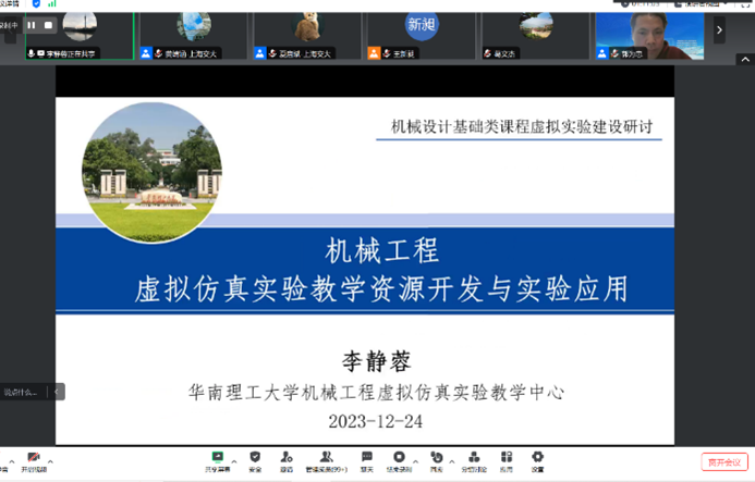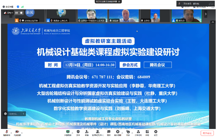12月24日,“机械设计基础类课程虚拟实践建设”专题研讨活动线上举行,此次活动由上海交通大学牵头组建的教育部首批虚拟教研室建设试点“机械工程专业虚拟教研室”主办,机械原理课程群虚拟教研室、机械设计课程群虚拟教研室、机械原理及机械零件(设计)课程虚拟教研室、西南地区机械基础课程群虚拟教研室、机械设计基础课程虚拟教研室5家单位共同协办。教育部机械基础课程教学指导分委员会主任阎绍泽、机械原理课程群虚拟教研室主任王德伦、机械设计课程群虚拟教研室常务副主任王黎钦、机械原理及机械零件(设计)课程虚拟教研室主任葛文杰、机械工程专业虚拟教研室代表、上海交大80足球直播吧副院长夏唐斌出席活动。各高校成员单位领导及教师代表等160余人线上参会,会议由上海交大“设计与制造II”课程负责人郭为忠主持。
