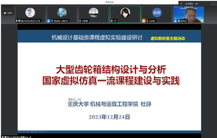 重庆大学杜静做题为“大型齿轮箱结构设计与分析国家虚拟仿真实验建设与实践”的主题报告,介绍了重庆大学通过行业、企业合作共建、共享,将国家级科研成果转化为实验教学内容的实践过程。