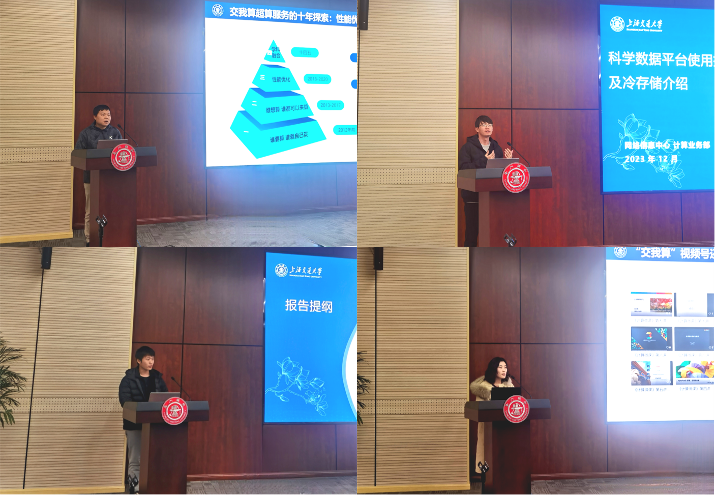 主题报告环节,林新华从整体上介绍了“交我算”平台的发展历程和现状,包括“交我算”计算资源、服务团队与模式以及对全校科研创新的支撑等,重点展示了机械动力学院用户的计算现状概览。文敏华结合多个不同学科的案例,展示了“交我算”学科融合和代码优化服务的显著成果。李瑞介绍了工程计算中的AI4S案例分享,重点介绍了如何将机器学习和深度学习模型应用于传统的力学问题求解、化学物质分类中。王星泽围绕“交我算”新推出的科学数据平台和冷存储系统,重点介绍了科学数据平台的基本功能、使用方法以及冷存储系统使用指南等知识。于潇雪对“交我算”的教学支撑服务进行了介绍,包括免费申请相关课程计算资源、计算融合课程的开设等内容。