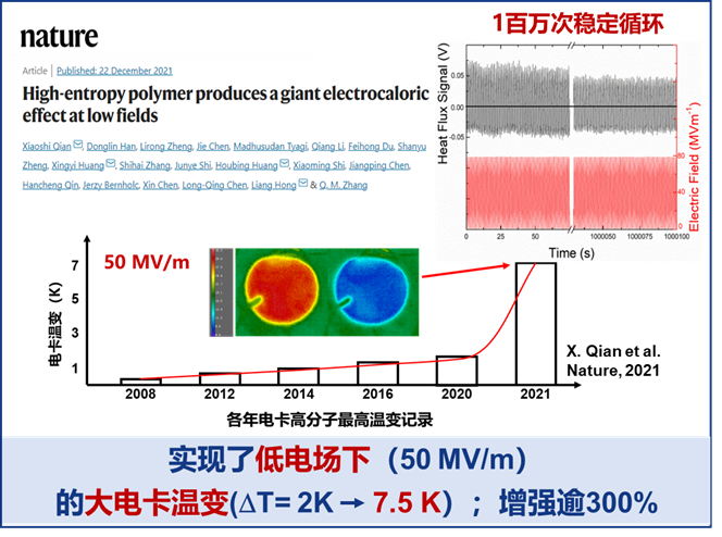 巨电卡效应是一种奇异的凝聚态物理现象,利用电介质充放电过程中的可逆电致温变组成制冷循环,逆着温度梯度输运热量。电卡制冷系统使用固态电介质作为制冷材料,功耗小、能效高,具有零温室效应潜能(GWP)、易于小型化/轻量化等特点,是热管理领域重要的颠覆性前瞻技术之一。项目在国际上首次提出了极化高熵材料设计方法,制备了一种极化高熵高分子,显著增强了其低电场下的电卡制冷能力(近400%),制冷材料循环寿命提升超过20000倍,首次了实现百万次无损循环,突破了制约领域发展的一项关键瓶颈。相关研究工作近两年发表于Nature、Science等高水平学术刊物。