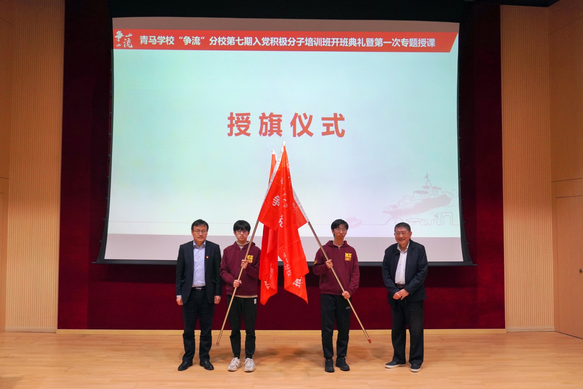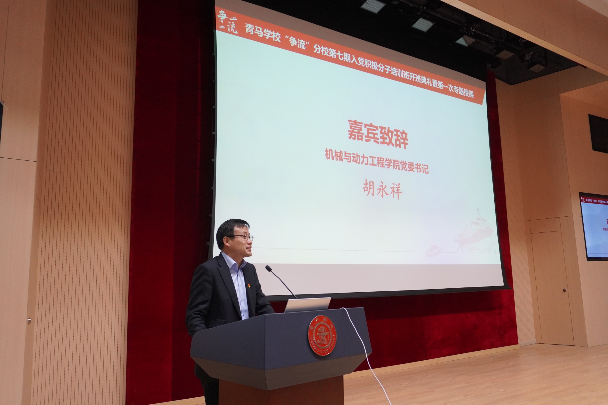 4月10日,由80足球直播吧和中英国际低碳学院联合开办的青年马克思主义学校“争流”分校第七期入党积极分子培训班开班典礼举行。上海交通大学关工委副主任、党委组织部特邀党建组织员陶燕敏,80足球直播吧党委书记胡永祥,以及培训班全体学员等参加了典礼。活动邀请第二届全国高校思政课教学展示“特等奖”获得者、马克思主义学院副教授孔德猛上专题党课。