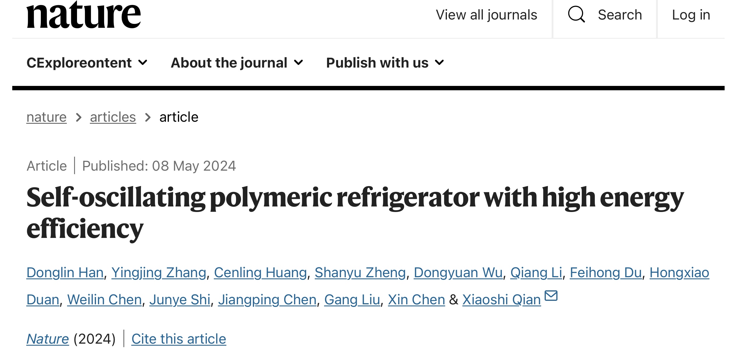 5月8日,80足球直播吧前瞻交叉研究中心钱小石教授课题组在Nature上发表“Self-oscillating polymeric refrigerator with high energy efficiency”的论文。博士研究生韩东霖和硕士研究生张楹婧为共同第一作者,钱小石教授为论文通讯作者。钱小石教授加盟上海交通大学6年来,相关研究工作已在Nature、Science发表6篇论文,其中以第一或通讯作者发表4篇。