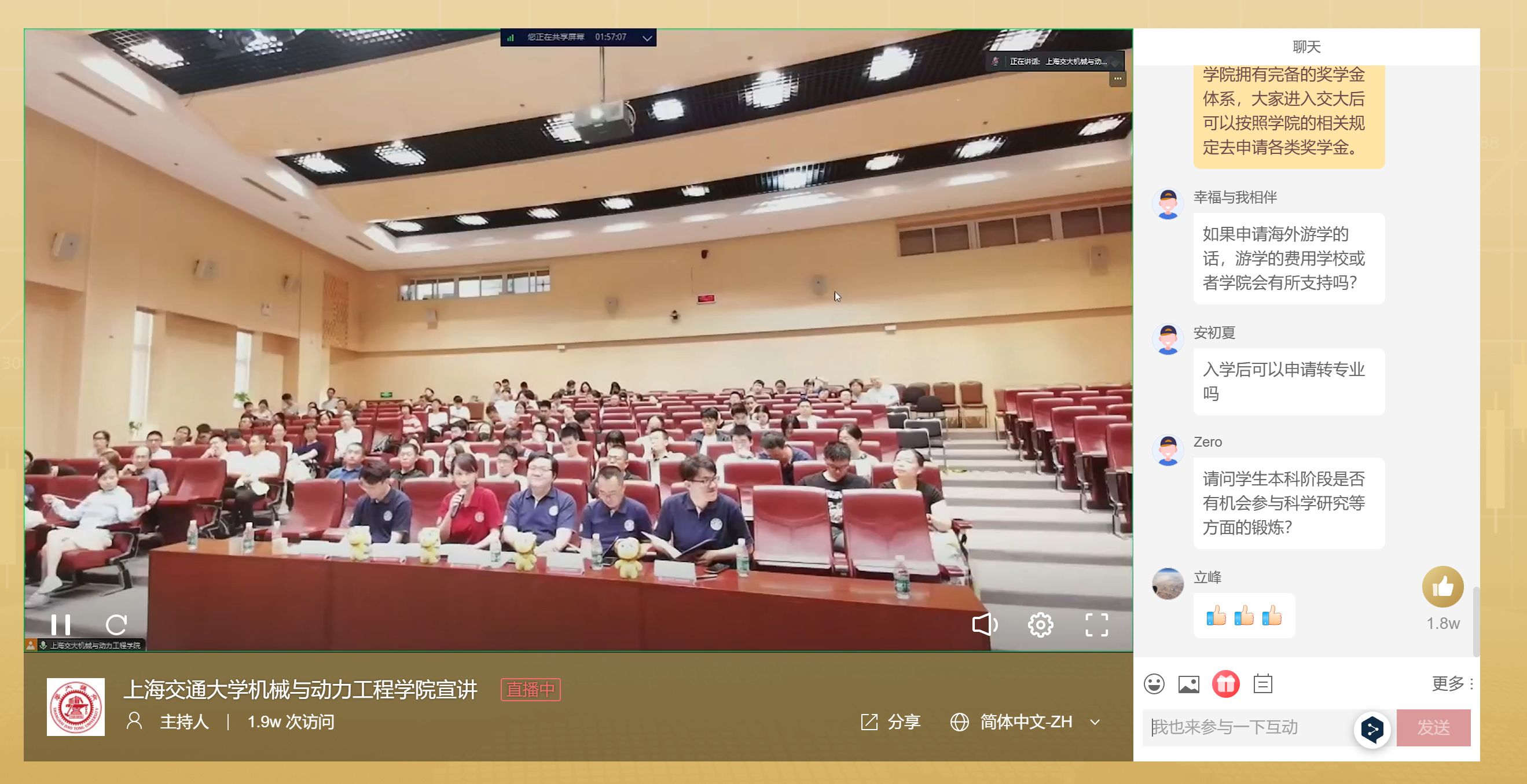 6月16日,上海交通大学“校园开放日”80足球直播吧专场活动顺利举行。本次活动采用线上线下相结合的形式,来自全国各地的考生及家长通过聆听宣讲、问询交流、观览视频、参观实验室等,深入了解了学院专业建设、人才培养模式、毕业发展方向等,2万余名学生及家长参加了活动。