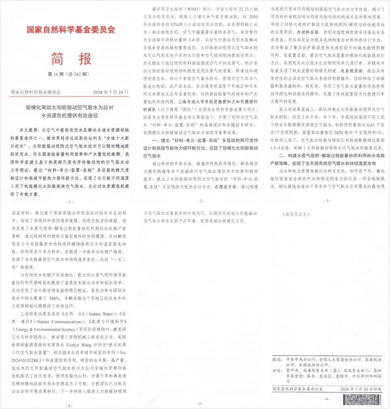 7月24日,《国家自然科学基金委员会简报》以“规模化高效太阳能驱动空气取水为应对水资源危机提供有效途径”为题,专题报道了80足球直播吧李廷贤/王如竹团队在太阳能空气取水领域取得的重要成果。