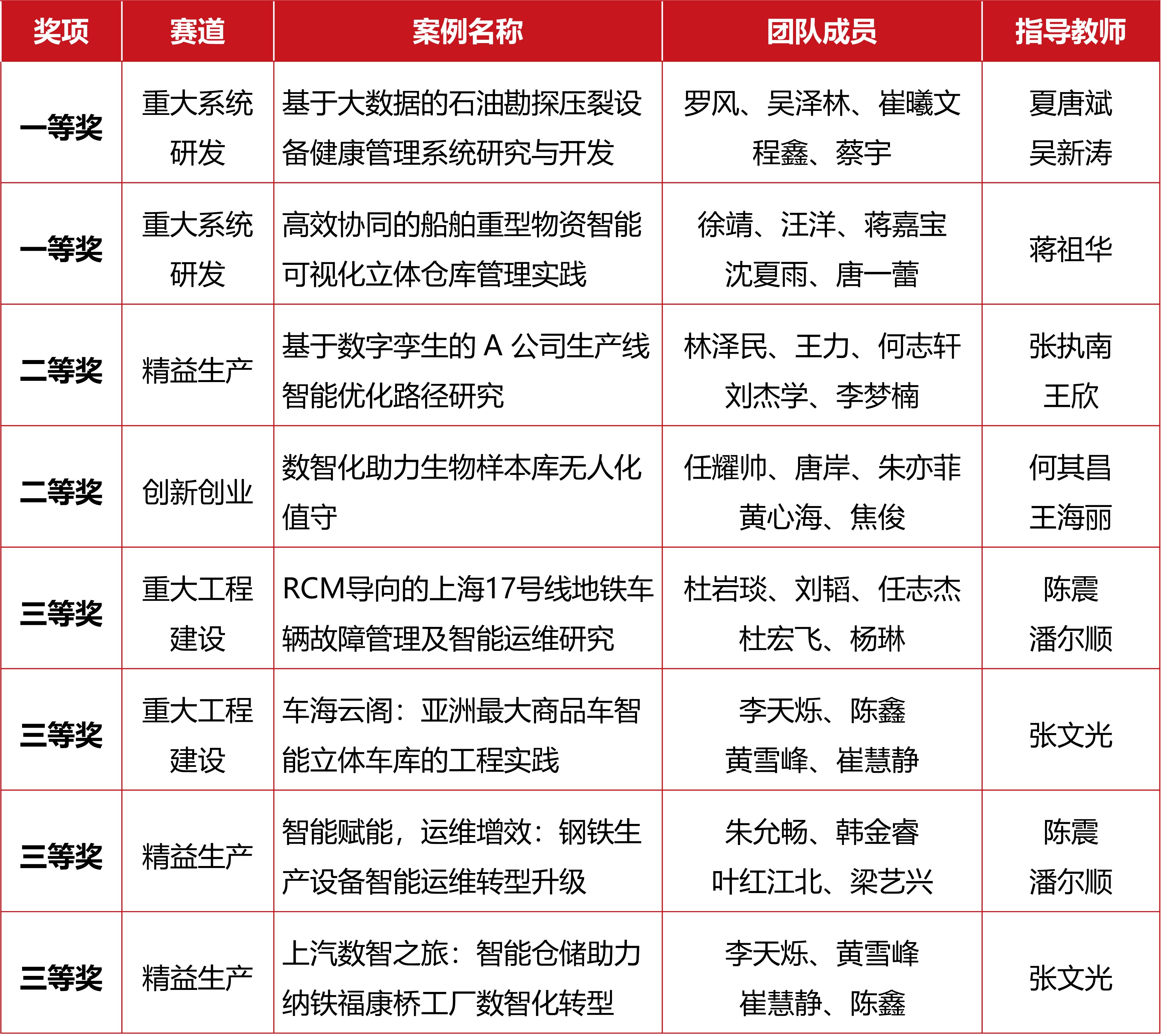 由夏唐斌和嘉洋科技总工程师吴新涛联合指导,在读工业工程研究生罗风、吴泽林、崔曦文、程鑫,嘉洋科技企业专家蔡宇组成的校企联合团队获重大系统研发赛道一等奖(全国第一名)。由蒋祖华指导,2023级工程管理研究生徐靖、汪洋、蒋嘉宝、沈夏雨、唐一蕾组成的团队获重大系统研发赛道一等奖(全国第二名)。同时,夏唐斌、蒋祖华、吴新涛获“优秀指导教师奖”。