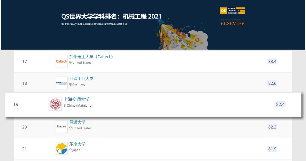 日前,QS发布2021年度世界大学学科排名,上海交大80足球直播吧的机械工程(Mechanical Engineering)学科位列第19,是交大排名最好的学科。
