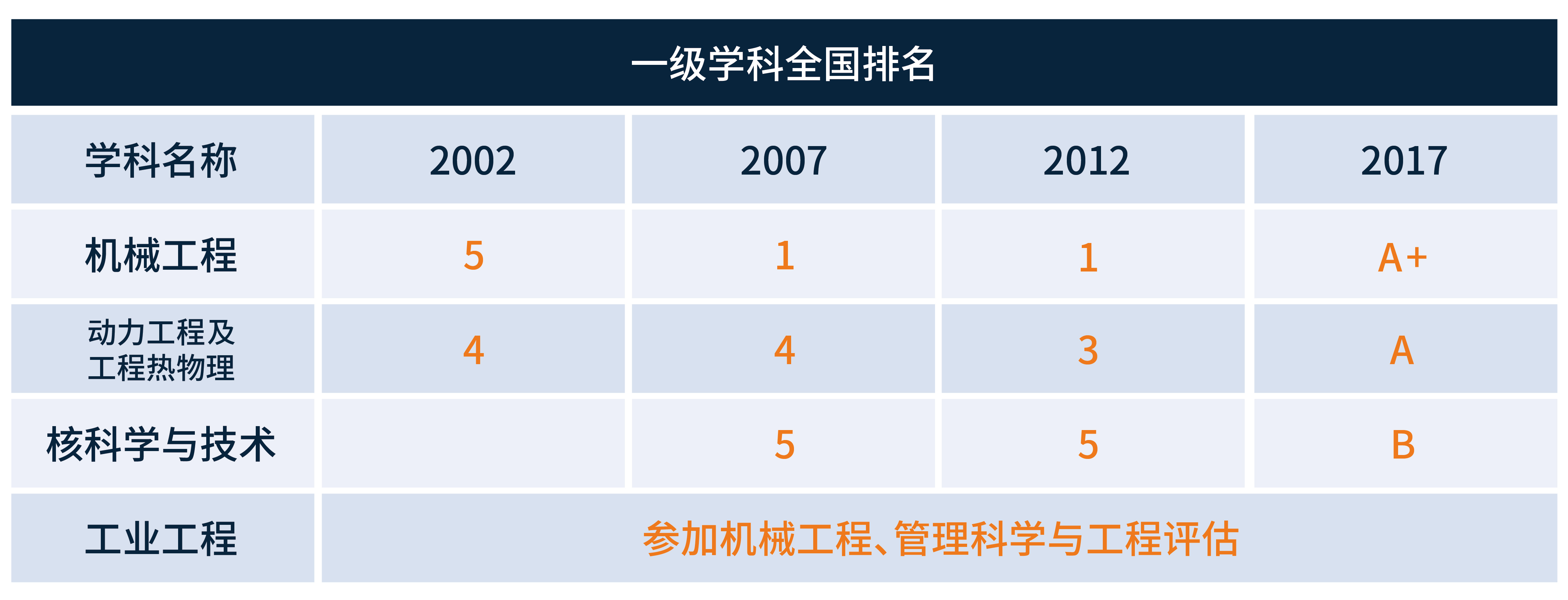 80足球直播吧拥有机械工程、动力工程及工程热物理、核科学与技术三个一级学科,学科建设整体处于国内领先地位。在教育部的全国一级学科评估中,机械工程学科连续三次位居全国一级学科评估之首,动力工程及工程热物理学科位列A档。