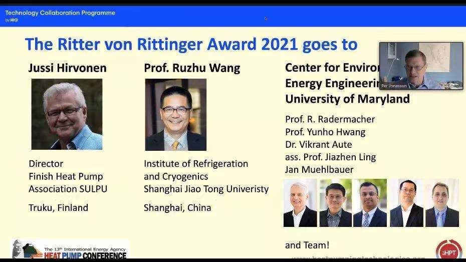 Rittinger国际热泵奖由国际能源署2005年设立,每三年颁发一次,表彰在热泵技术的国际合作研究、政策发展和应用等方面所做出杰出贡献的研究人员,被誉为“空调、热泵和制冷领域的最高国际奖(highest international award in the air conditioning, heat pump and refrigeration field)”,此前的获奖者包括瑞典皇家理工学院副校长、瑞典工程科学院院士Per Lundqvist教授,普渡大学机械工程学院院长Eckhard A Groll教授以及美国橡树岭国家实验室建筑设备团队等。2021年获奖者包括芬兰热泵协会主席Jussi Hirvonen,美国马里兰大学环境与能源工程中心R. Radermacher教授团队。