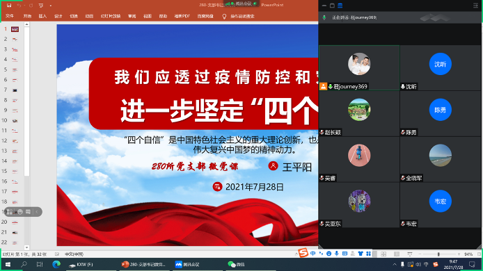 7月28日,工程热物理研究所党支部开展党史学习教育主题党日活动,支部书记王平阳讲授关于“道路自信和理论自信”的微党课,活动以线上与线下相结合的形式进行。