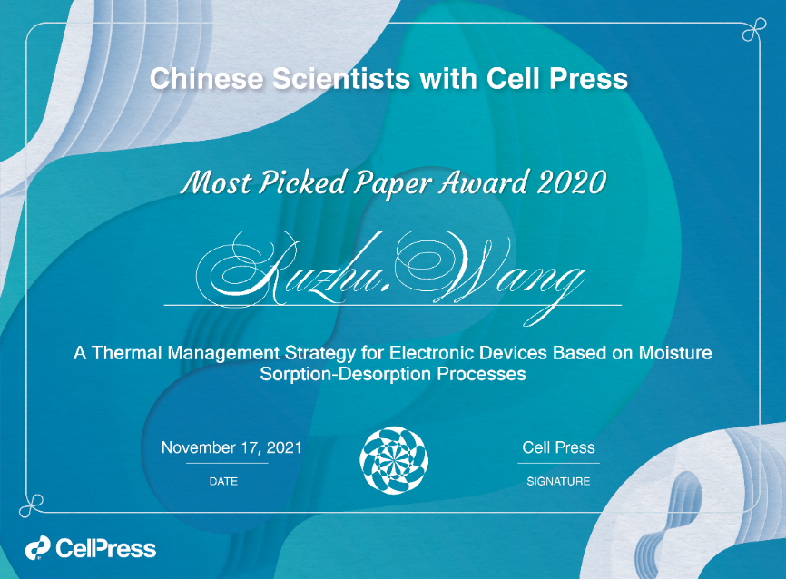 11月17日,Cell Press 2020年度最受欢迎中国论文正式揭晓,王如竹教授团队在Joule上发表的论文“A Thermal Management Strategy for Electronic Devices Based on Moisture Sorption-Desorption Processes”获选,是上海交大唯一获选的论文。论文第一作者是上海交通大学博士研究生王晨曦,王如竹为通讯作者。