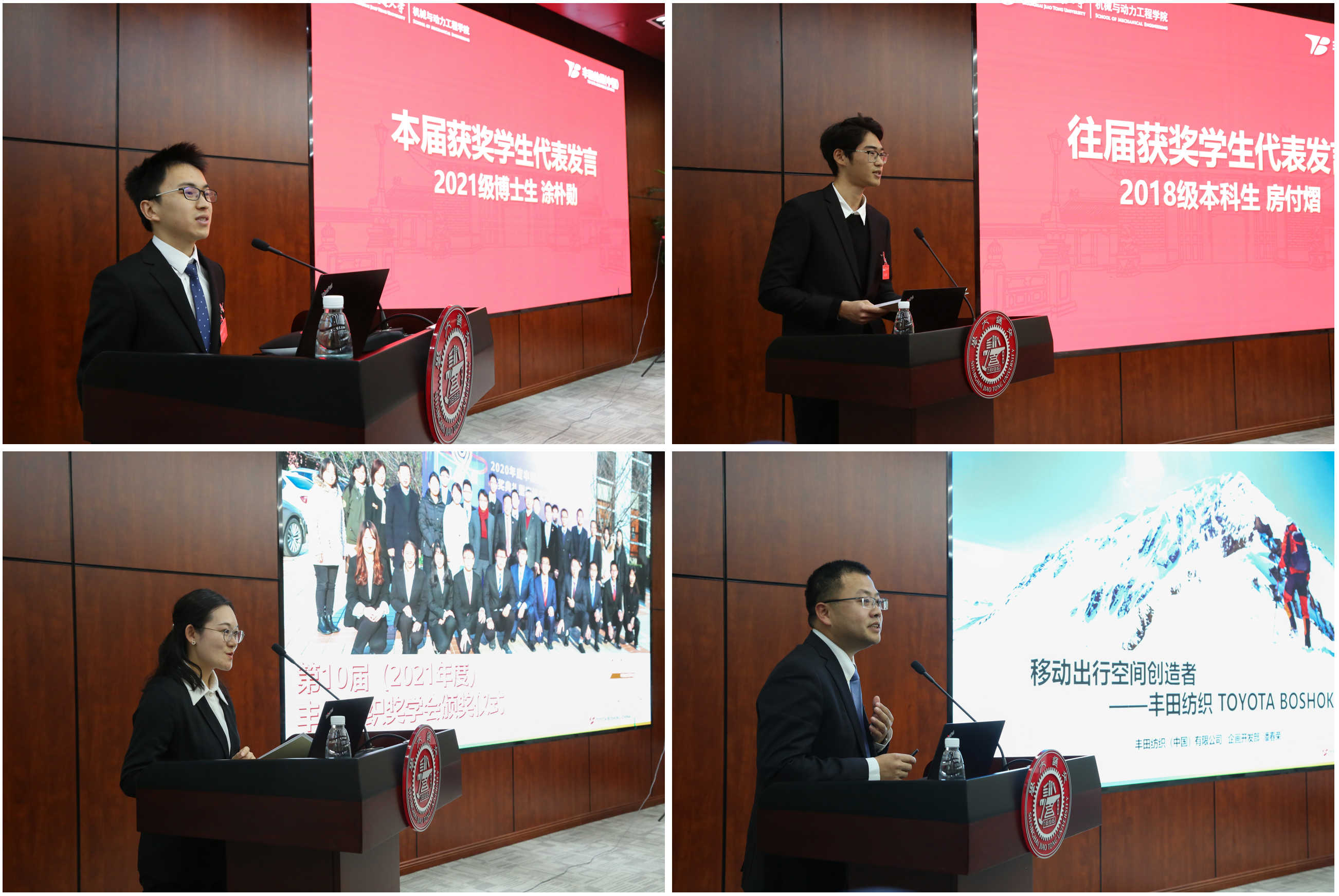 涂朴勋、房付熠分别作为本届及往届获奖学生代表发言。两位同学表示将以更高的标准要求自己,饮水思源、不负青春,成为一个对社会有用的人。嵇蕾和潘春荣分别作丰田纺织奖学会活动报告和企业技术介绍。