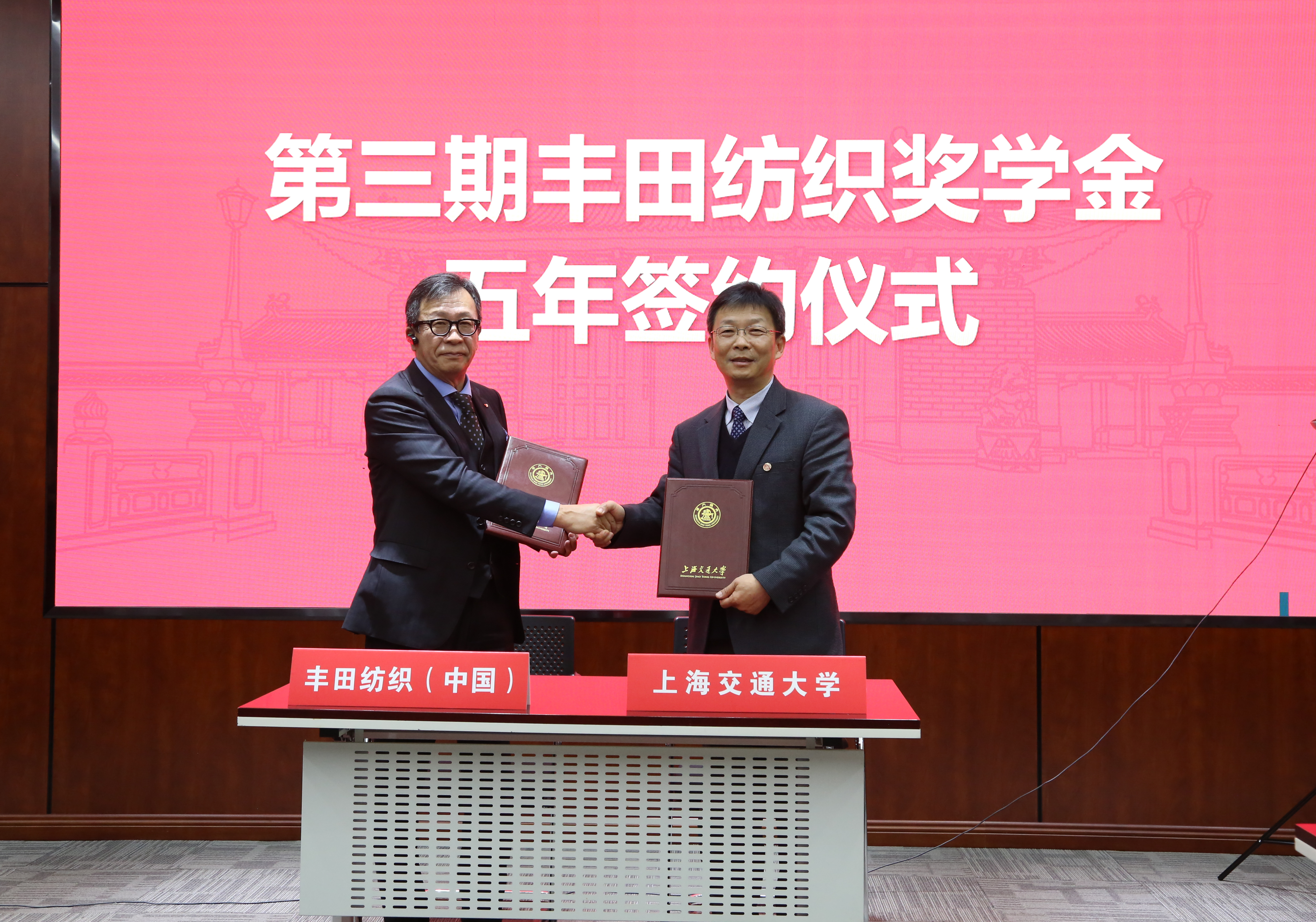 会上还举行了第三期丰田纺织奖学金五年签约仪式。庄志强结合自身经历,从奖励优秀学子、为汽车产业做贡献、为社会培育有用之才三个方面,简要介绍了丰田纺织奖学金奖教金的设立初衷,希望双方在科学研究和人才培养领域进行更加深入的合作,为中日文化与科研交流作出贡献。