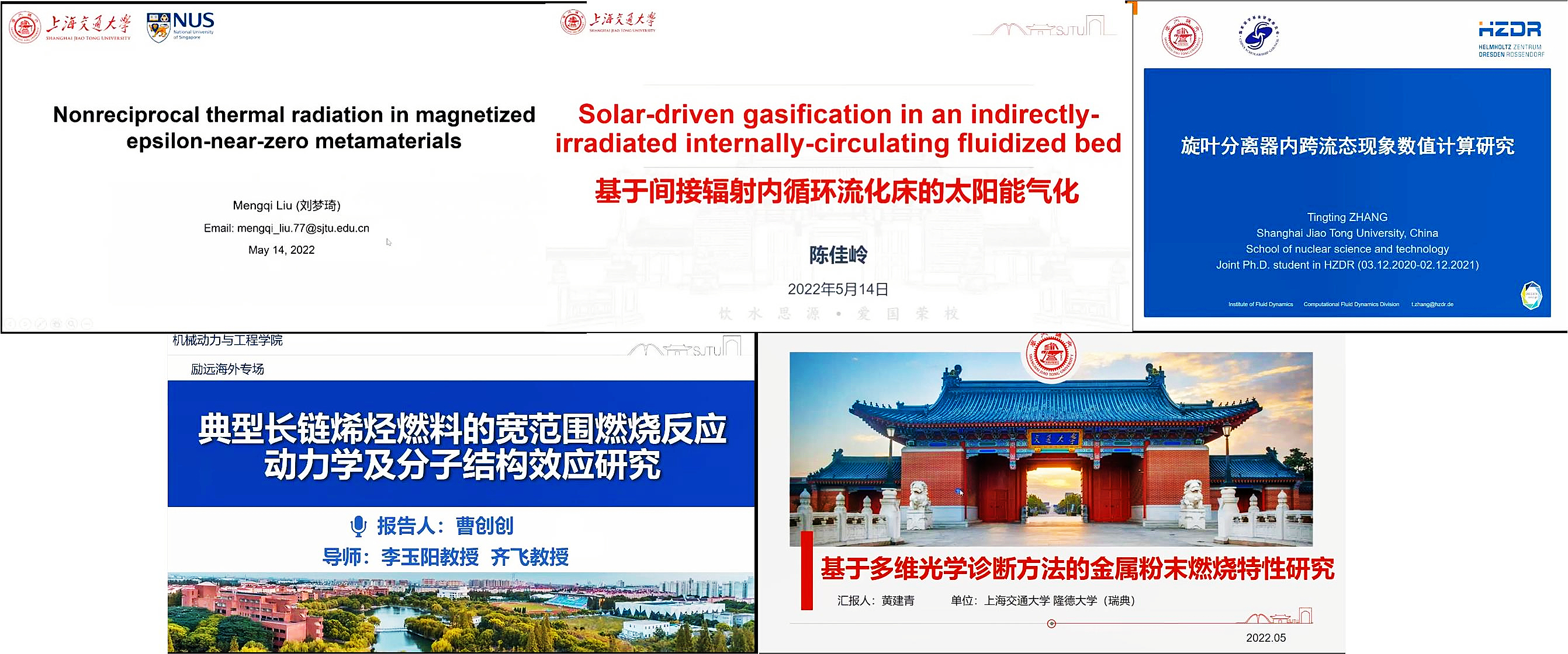 80足球直播吧制冷与低温工程研究所博士研究生陈佳岭、航空动力研究所博士研究生曹创创、工程热物理研究所博士研究生刘梦琦、核科学与工程学院博士研究生张婷婷、叶轮机械研究所博士研究生黄建青,分别围绕“基于间接辐射内循环流化床的太阳能气化技术”、“典型长链烯烃燃料的宽范围燃烧反应动力学及分子结构效应研究”、“近零磁化超材料中的非互易热辐射技术”、“叶片式气液分离器形态自适应混合模型的验证技术”、“基于多维光学诊断方法的金属粉末燃烧特性研究”进行了分享。