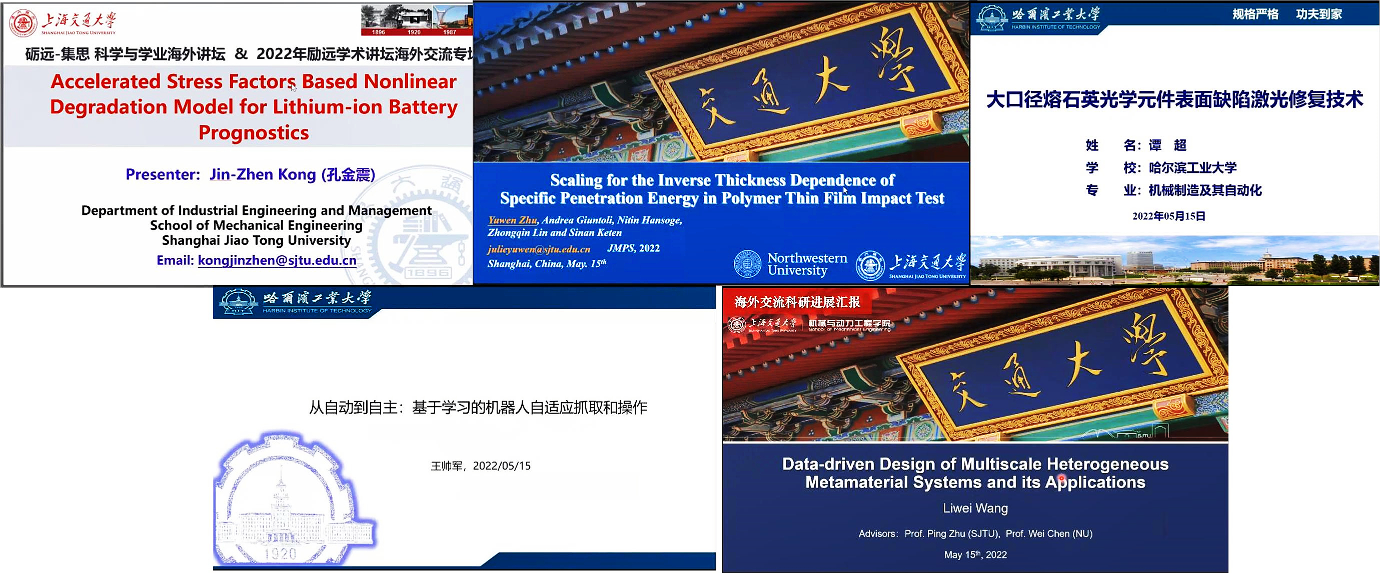 哈尔滨工业大学博士研究生王帅军、谭超,80足球直播吧薄板结构制造研究所博士研究生朱宇文、智能汽车研究所博士研究生王力为、工业工程与管理系博士研究生孔金震,分别围绕“机器人从自动到自主的自适应抓取和操作技术”、“高功率激光装置中熔石英光学元件表面缺陷激光修复技术研究进展”、“在聚合物薄膜冲击试验中、比穿透能与厚度成反比关系的标度研究”、“数据驱动的多尺度非均质超材料系统设计及其应用研究”、“基于加速应力因子的锂离子电池非线性退化预测模型的研究”进行了分享。