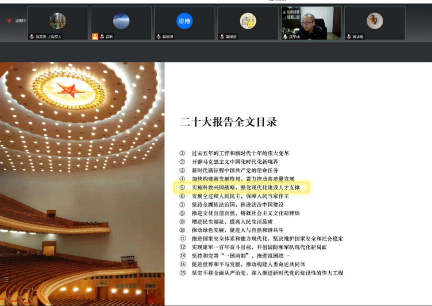 12月30日,航空动力研究所党支部教工党支部联合研究生党支部,组织开展学习党的二十大精神主题党日活动,邀请上海交通大学马克思主义学院沈辛成老师做题为“科技为根 人才为源:定位中国式现代化征程中的卡脖子问题”的主题讲座,50余名师生党员线上参加了此次活动。活动由航空动力研究所教工党支部组织委员沈昕主持。