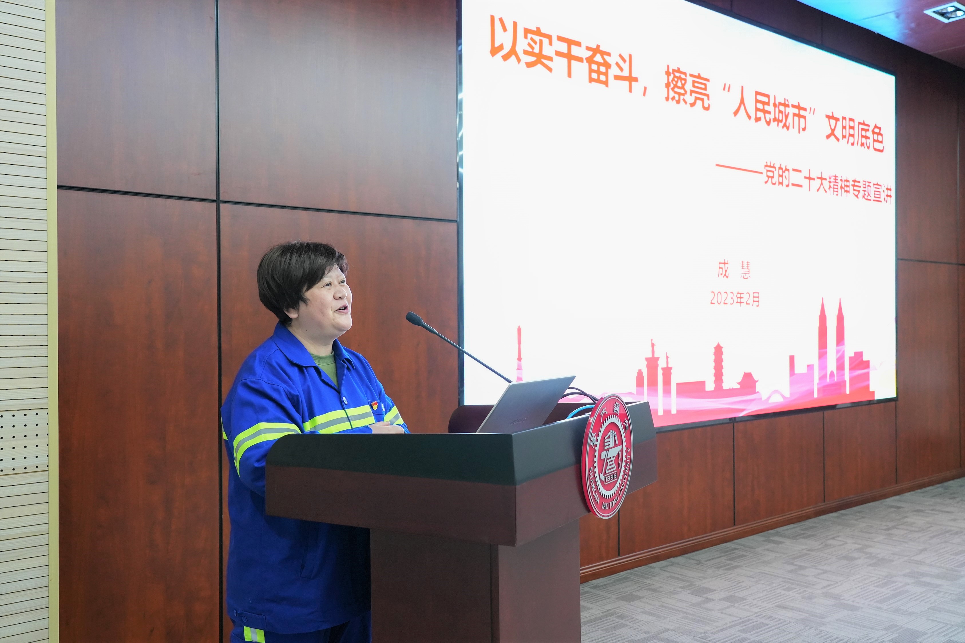 成慧以《以实干奋斗,擦亮“人民城市”文明底色》为题上“学习党的二十大精神”专题党课,讲述了作为二十大代表在人民大会堂现场聆听报告的自豪感和使命感,号召大家要把握党的二十大精神的核心要义和内涵精髓,学懂弄通并学以致用。她介绍了陈扣娣班班组在城市建设中接续奋斗的光辉历史、“三看五必访”的优秀传统、“八大作业保洁法”,以及“十大班组管理法”的创新工作举措,强调了爱国情怀、集体意识以及“干一行就要爱一行钻一行”的重要意义。同时结合自身成长经历,她介绍了环卫工人苦练“看家本领”,在抗击冰雪、迎战台风等工作中,践行“人民城市人民建,人民城市为人民”的初心和承诺,希望与机器人研究所加强合作,共同推动环卫事业的进步。成慧还就职业选择、党员职责等问题与学生进行了交流,希望大家爱岗敬业、对党忠诚,深耕行业领域,永葆工作热情。