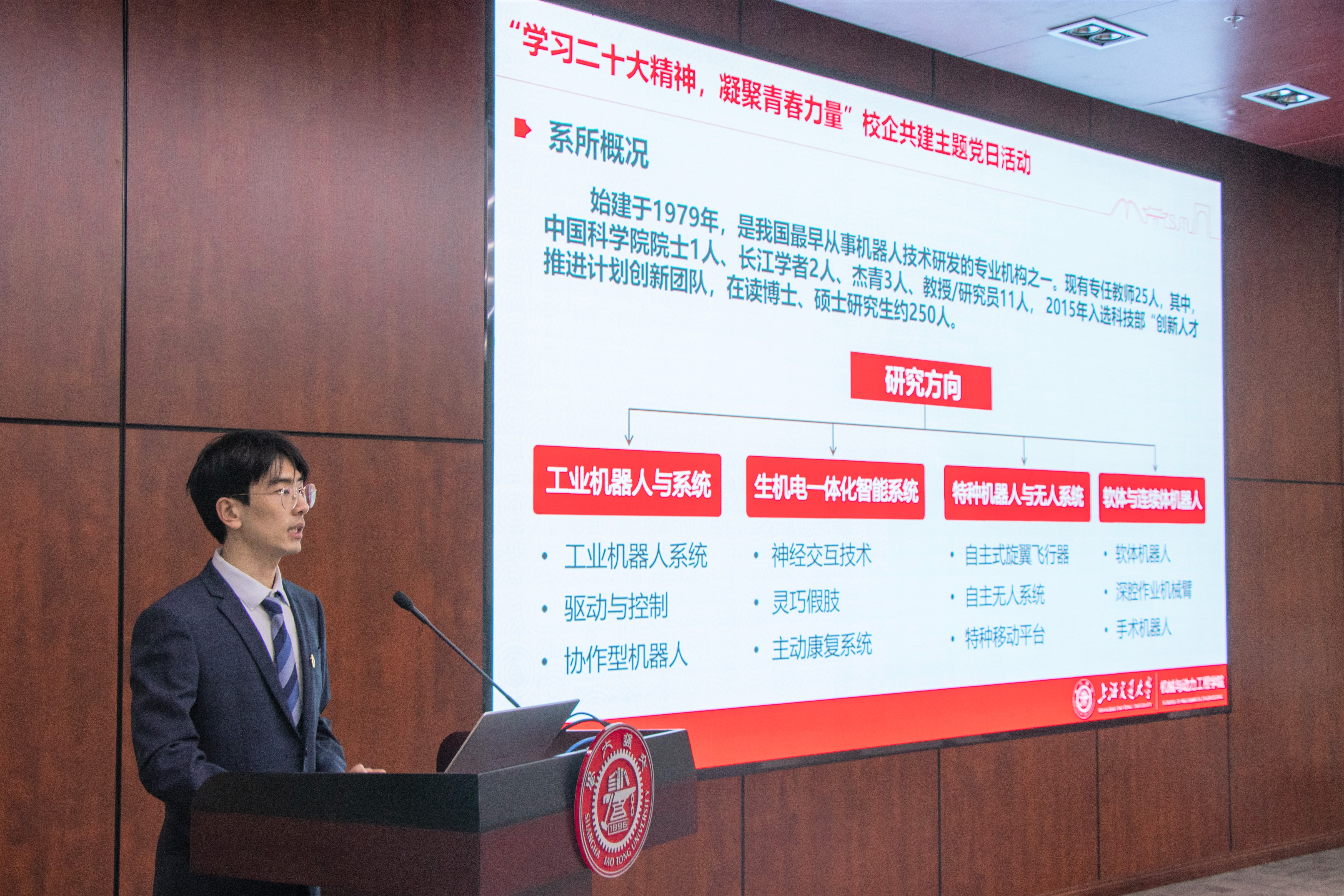 王宇轩以《助力工业智能化,勇担时代开拓者》为主题介绍了机器人研究所的研究方向、学术成果、研究生党支部建设等的情况。