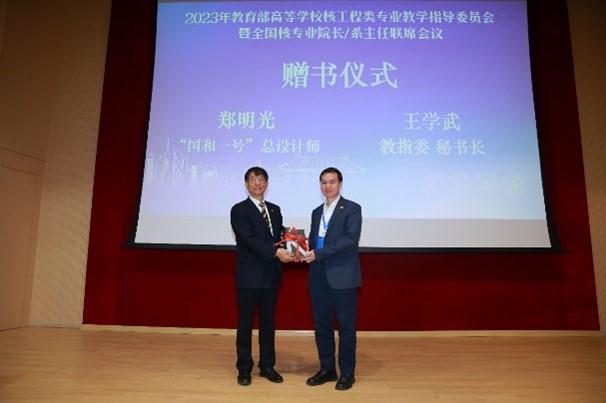 郑明光做“国家科技重大专项‘国和一号’的创新与展望”大会报告,介绍了“国和一号”的发展历程,对核工程人才培养提出了期望。郑明光还向教指委及参会人员捐赠了图书——《大型先进非能动压水堆CAP1400》,该书取材于我国科技重大专项“大型压水堆(CAP1400)”的科研和工程实践,系统介绍了CAP1400的研发过程和具体设计内容,同时论述了CAP1400的安全性与经济性、继承性和创新性以及先进性与成熟性等。