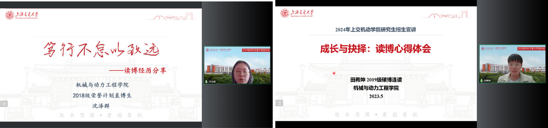 2018级荣誉计划直博生代表沈泽群以“笃行不怠以致远”为主题,分享了博士学习及科研过程中的感悟。2021级硕博连读生代表田希坤以“成长与抉择”为主题,勉励学子们时刻自省、积极思考。