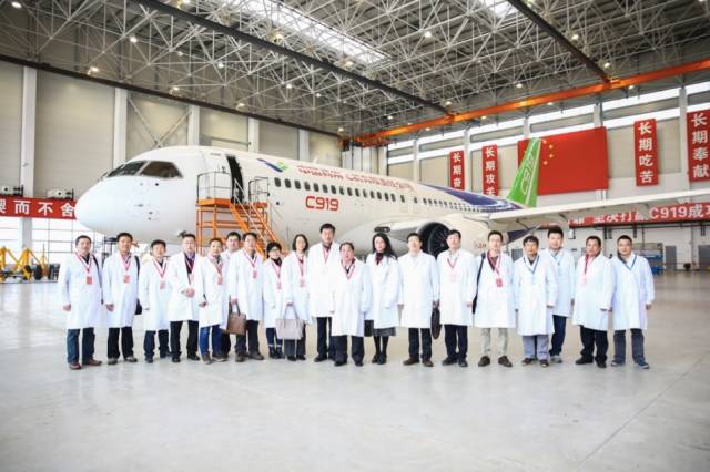 2017年4月11日,林忠钦院士、交大参与民机试飞工作的相关教师在C919首架机合影
