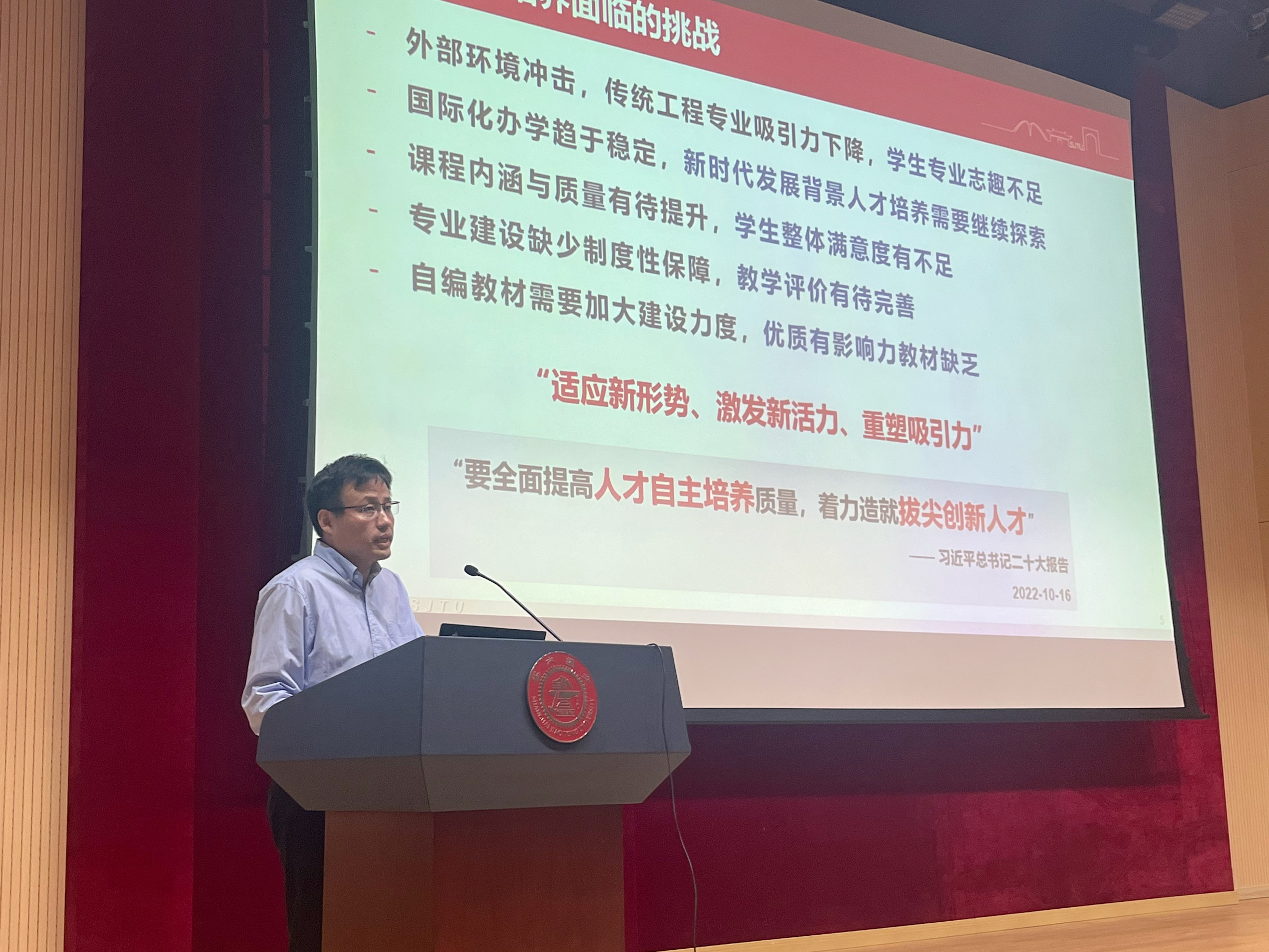 胡永祥从本科专业情况、教学改革举措、教学组织架构等方面,介绍了学院本科人才培养情况及主要政策,并就课程与教材建设、教师发展及教研项目、教学质量控制与日常教学规范等重点事项作了详细解读。