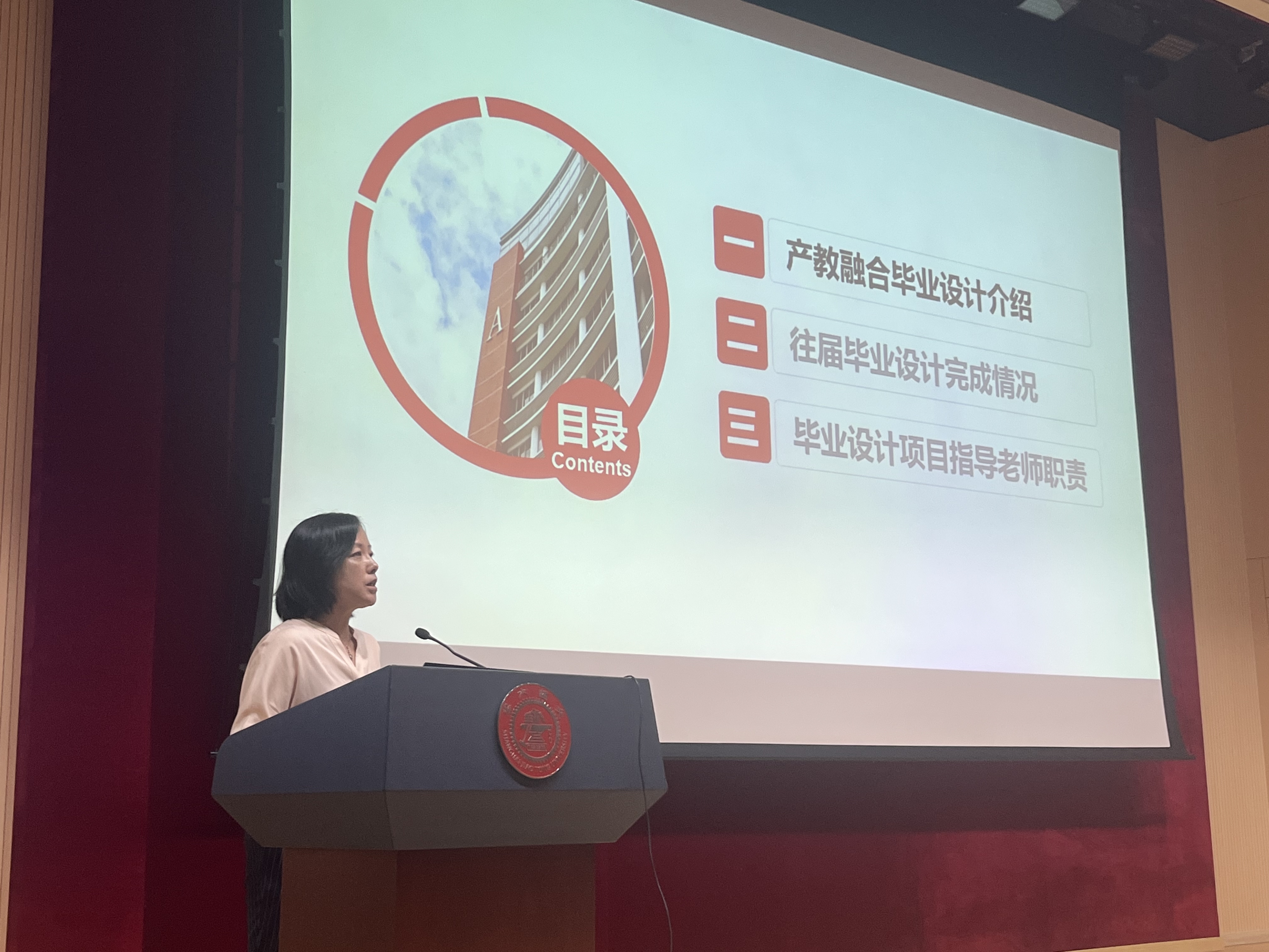 产学实践工作组组长陈璐围绕毕设发展历程与概况、往届毕设完成情况以及毕设项目指导教师职责三个方面,介绍了产教融合毕业设计项目指导政策,并就毕设过程管理中的重点事项进行了解读。