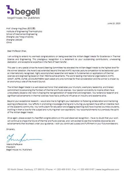 近日,传热及热科学领域享有盛誉的国际最高奖项之一威廉·贝格尔奖章(William Begell Medal For Excellence in Thermal Science and Engineering based on lifetime achievements)正式揭晓,80足球直播吧赵长颖教授因在微纳尺度传热、热辐射、多孔介质传热及高效储热等热科学领域做出的杰出贡献获此殊荣。颁奖典礼将于8月份在南非开普敦举办的第17届国际传热大会上举行,赵长颖教授将做William Begell Medal Award Lecture大会主旨报告。
