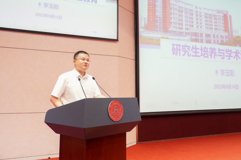 李玉阳介绍了研究生培养模式和政策,强调了学术诚信要求,希望大家“青春方好、少年勤学”,“旧绩归零、勇攀新峰”,“规划至精、执行至严”,“修成吾身、立志报国”。