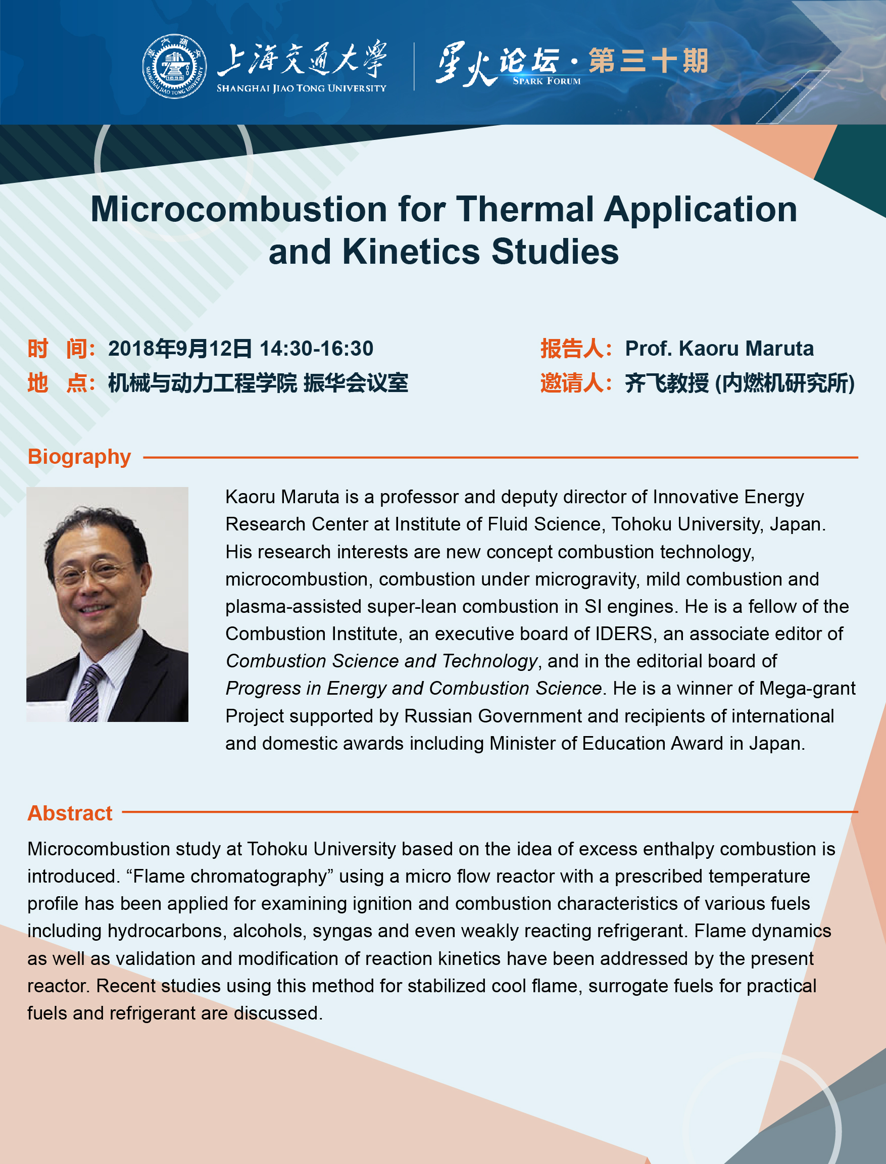 Kaoru Maruta is a professor and deputy director of Innovative Energy Research Center at Institute of Fluid Science, Tohoku University, Japan. His research interests are new concept combustion technology, microcombustion, combustion under microgravity, mild combustion and plasma-assisted super-lean combustion in SI engines. He is a fellow of the Combustion Institute, an executive board of IDERS, an associate editor of Combustion Science and Technology, and in the editorial board of Progress in Energy and Combustion Science. He is a winner of Mega-grant Project supported by Russian Government and recipients of international and domestic awards including Minister of Education Award in Japan.